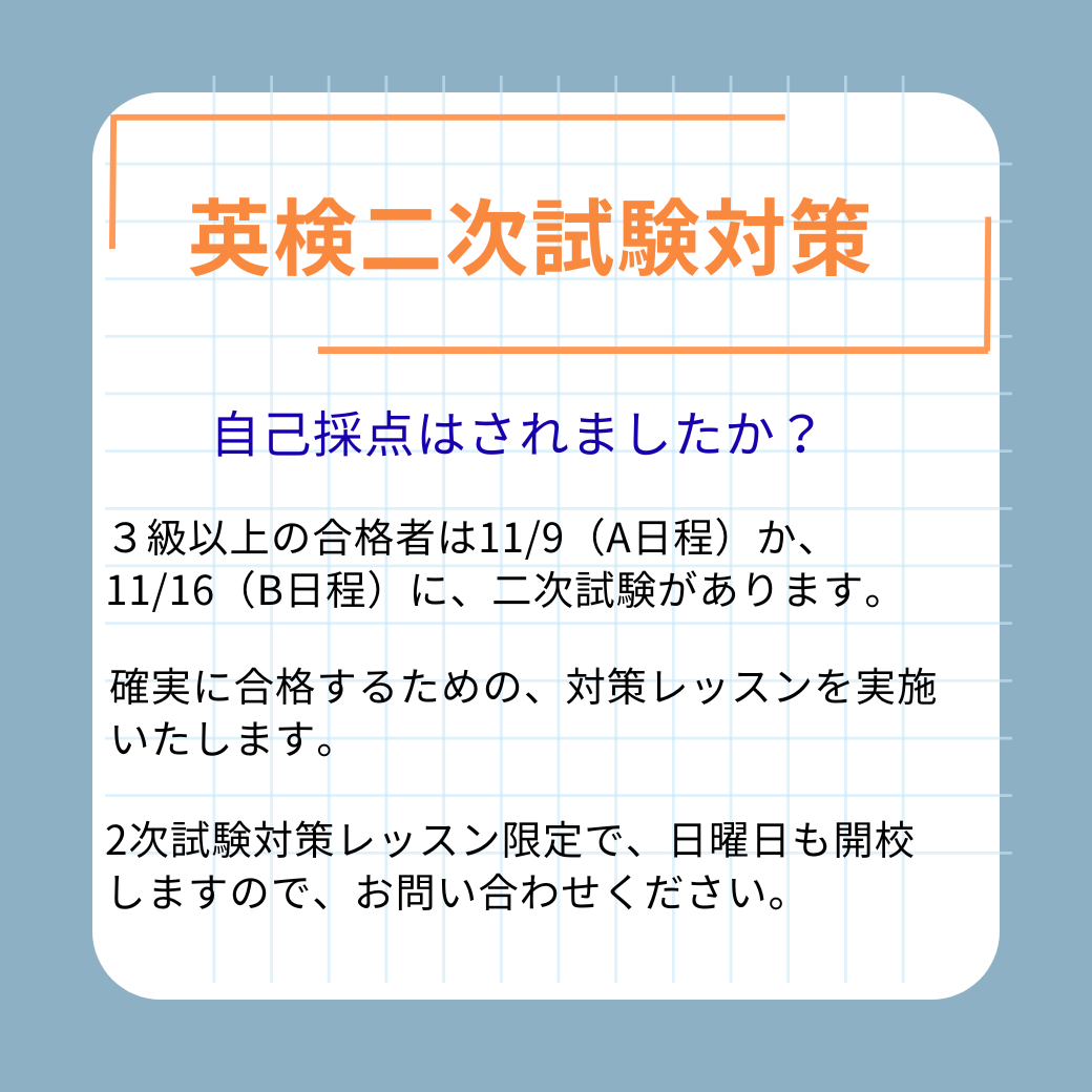 英検2次対策レッスンブログ2025.10.06 お申し込み・お問い合わせ お電話はこちら 090-7782-0876 受付時間:月〜金曜 13:00-19:00 / 土曜 10:00-18:00 お申し込み・お問い合わせフォーム お申し込み・お問い合わせ